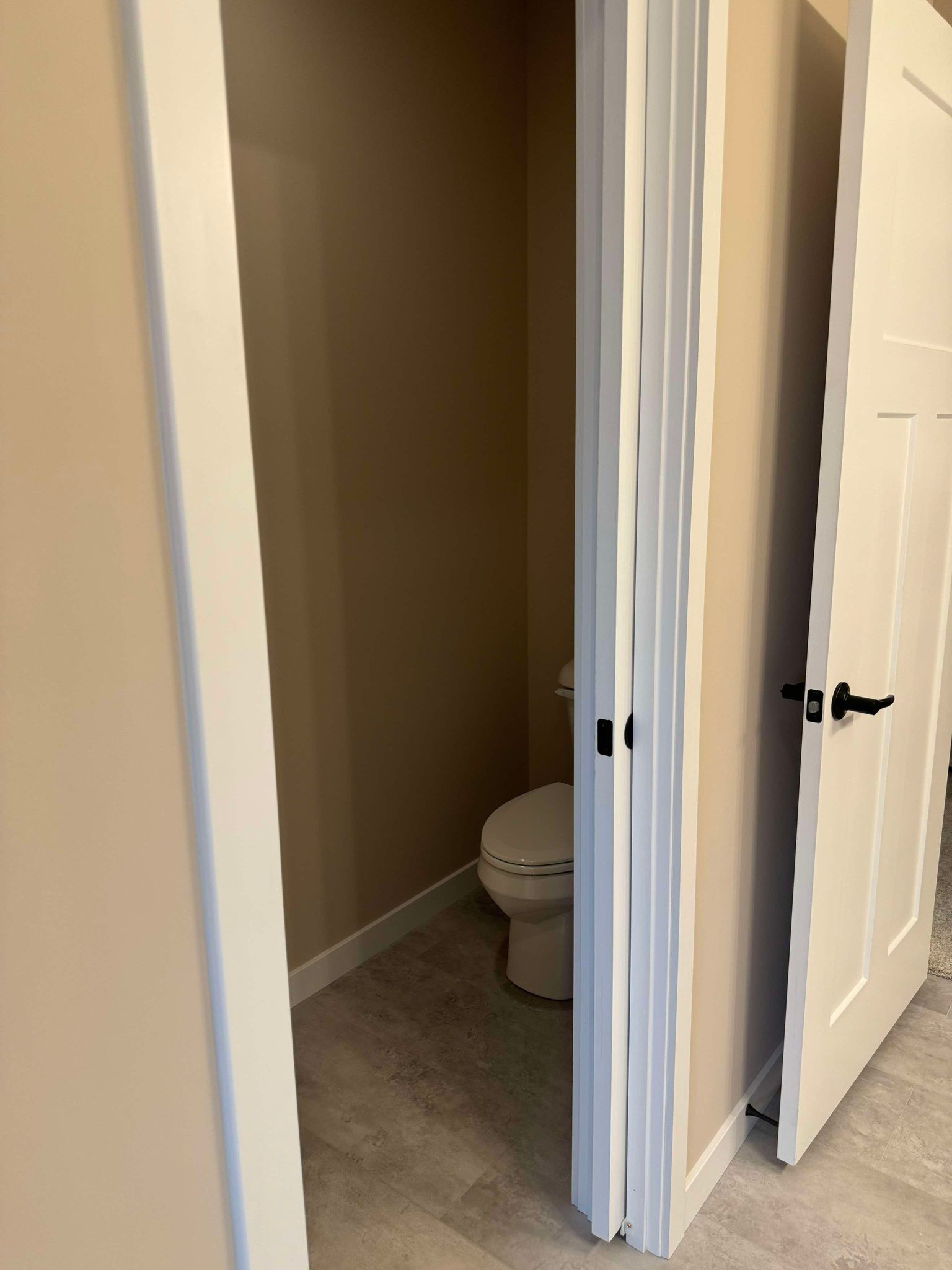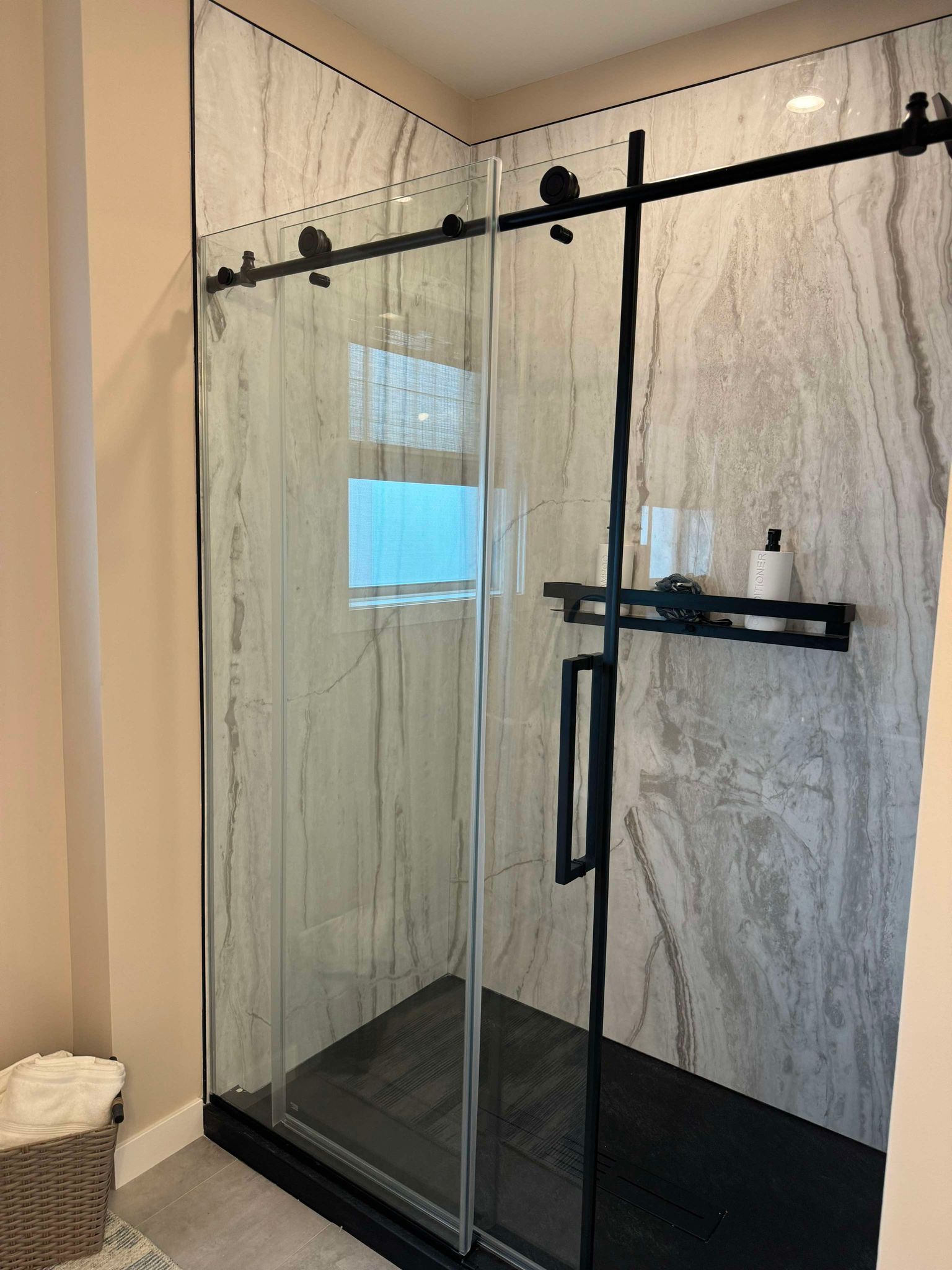 Duma-Wall shower with chrome slide-by, roller door in owner’s bath.