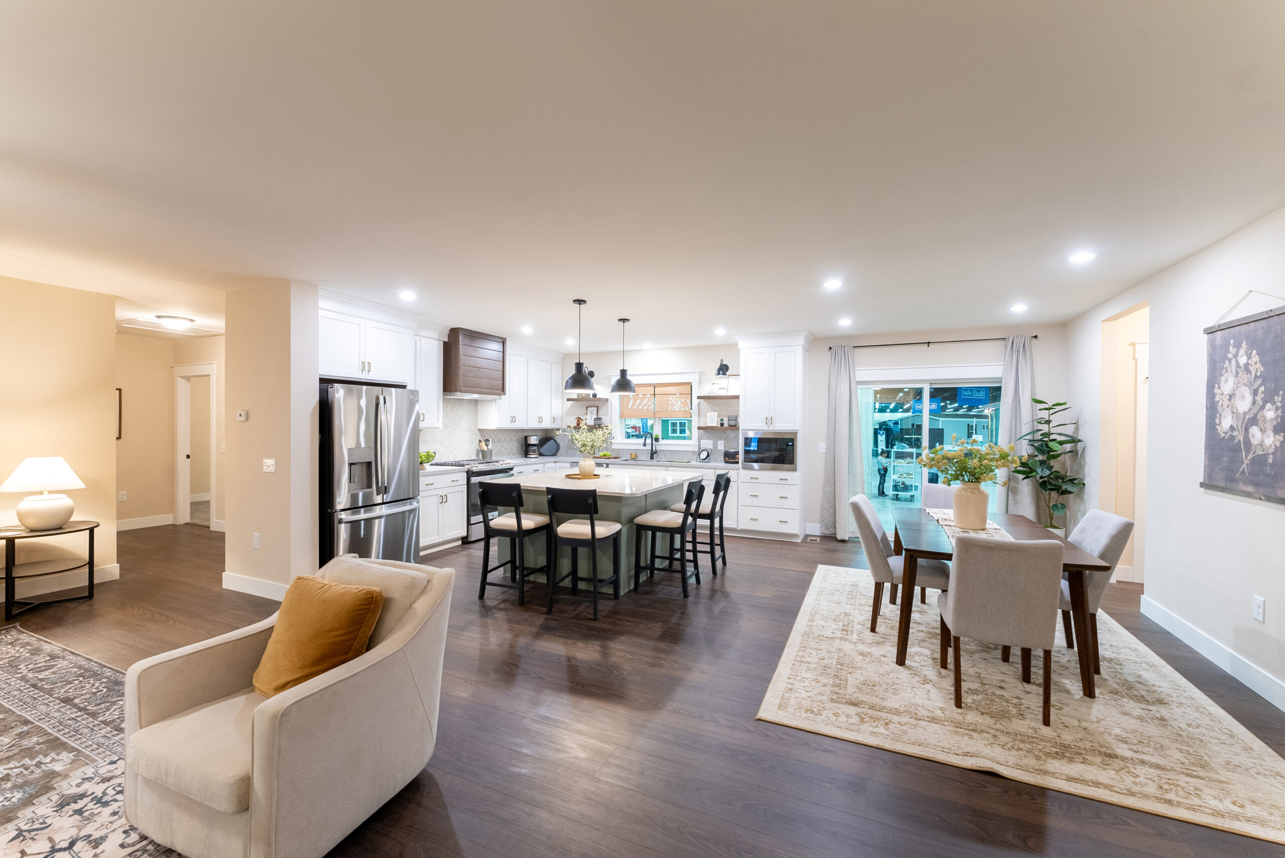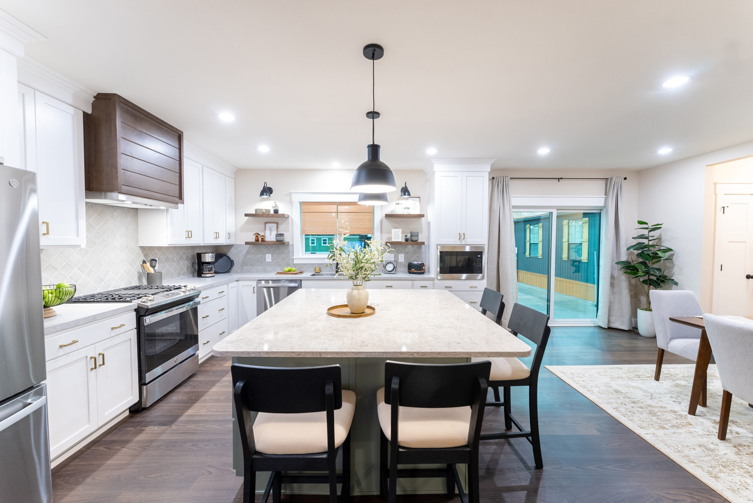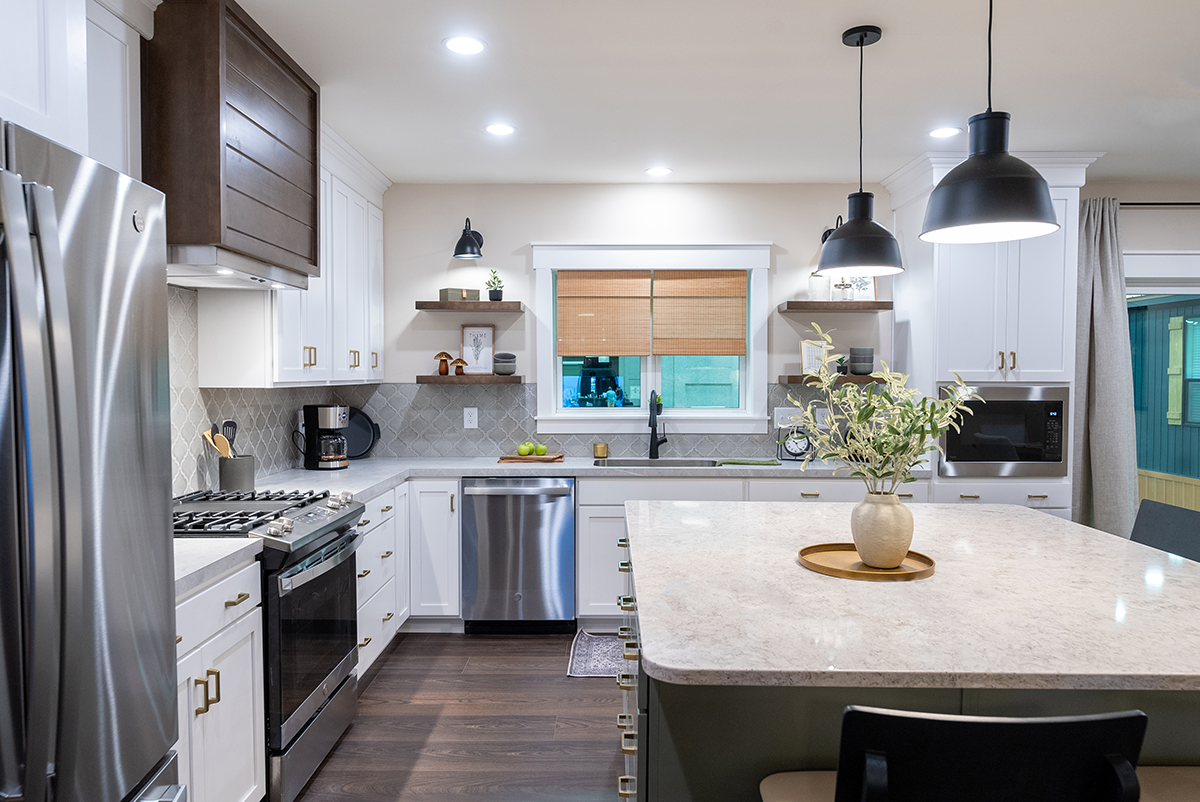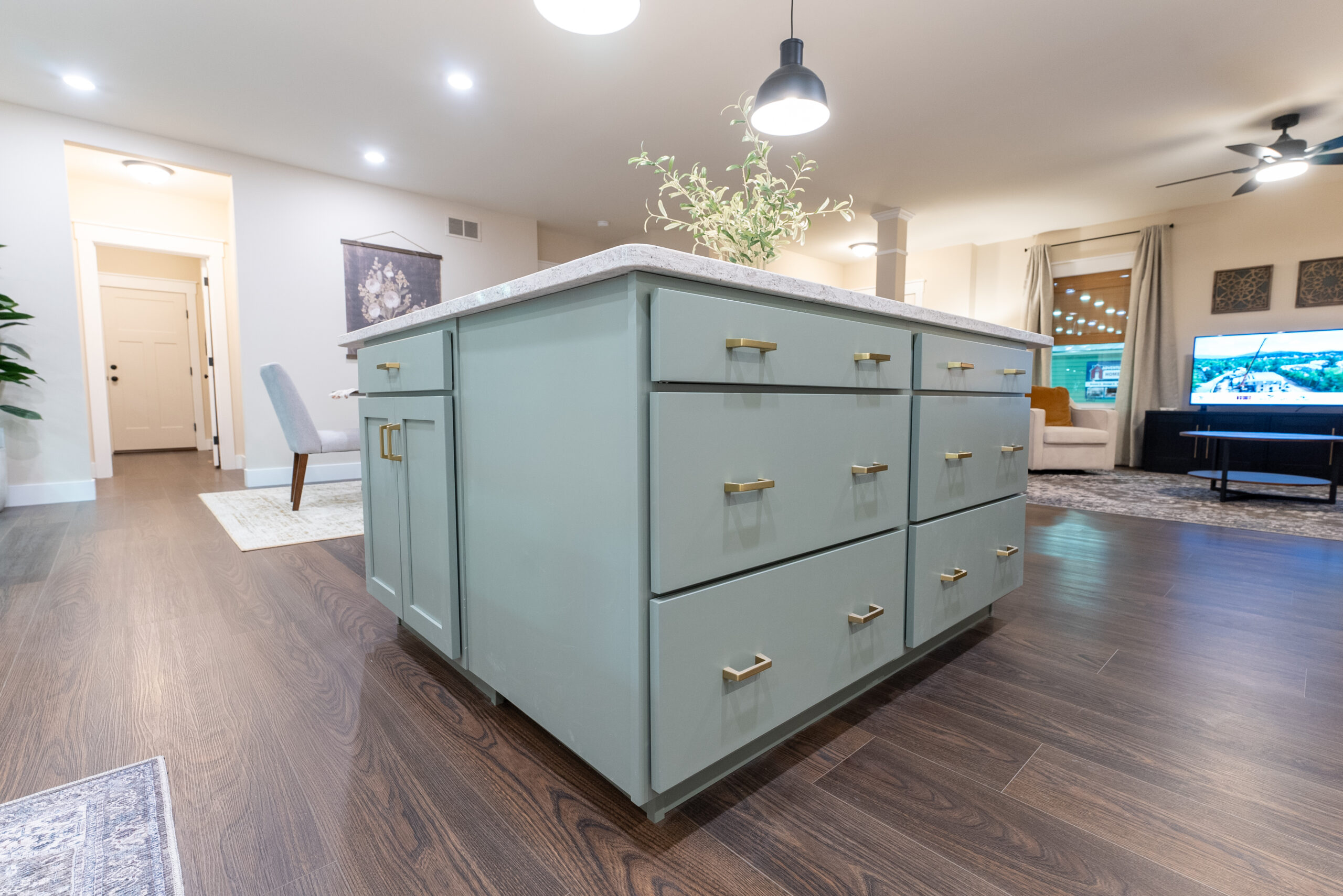Cambria Kitchen Island & Benchmark Evergreen Fog Island Cabinetry