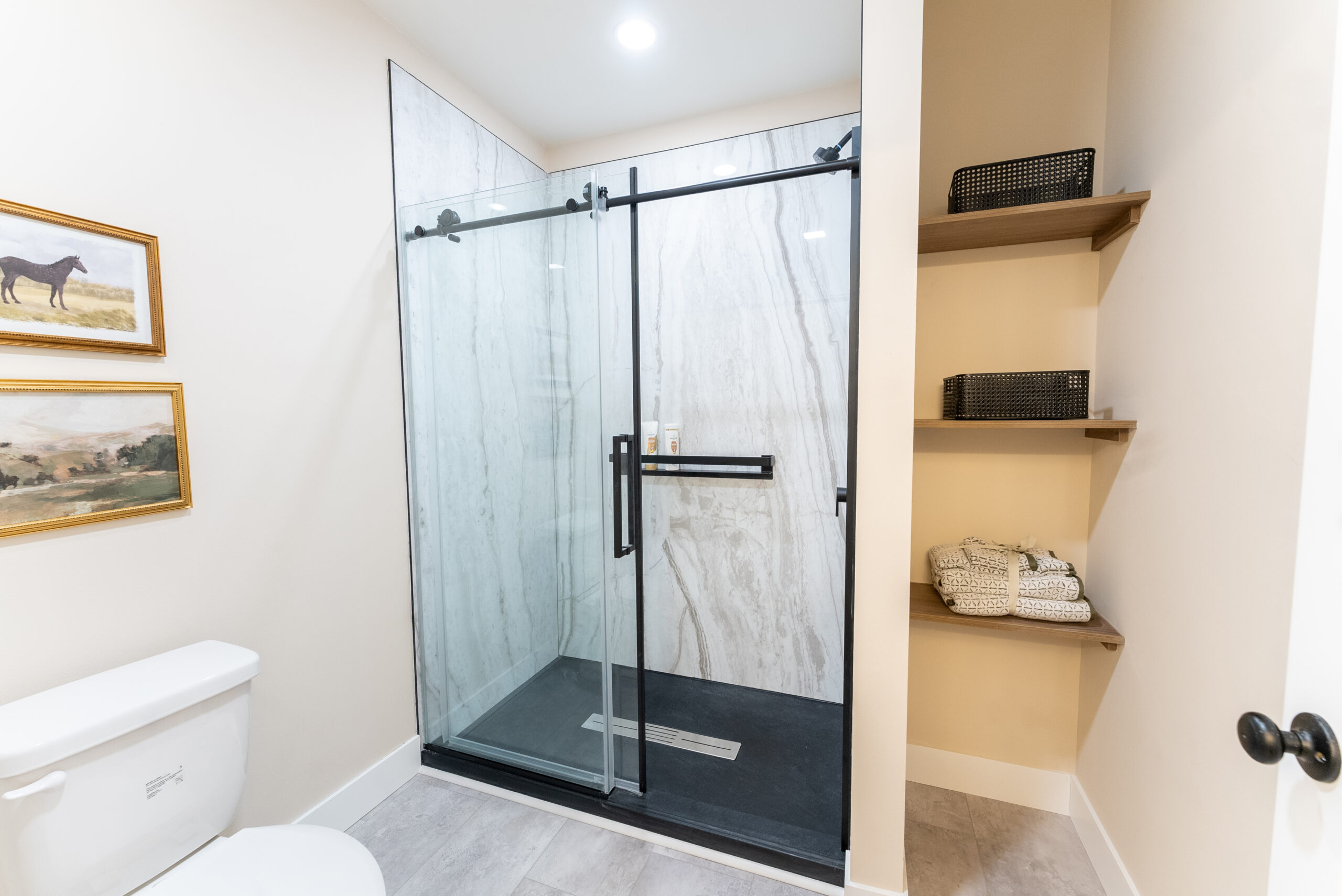 60’x36′ Samuel Mueller Shower (Sabana Gray w/ Black Pan)